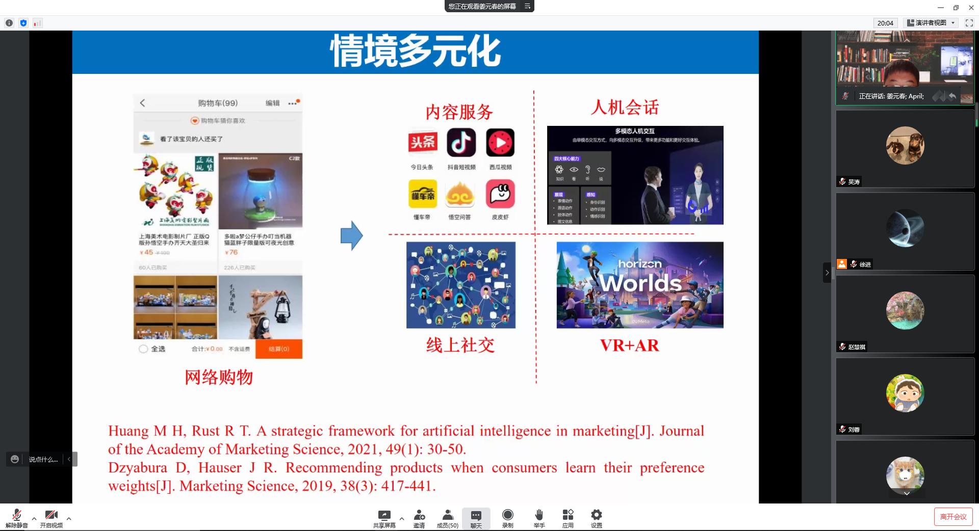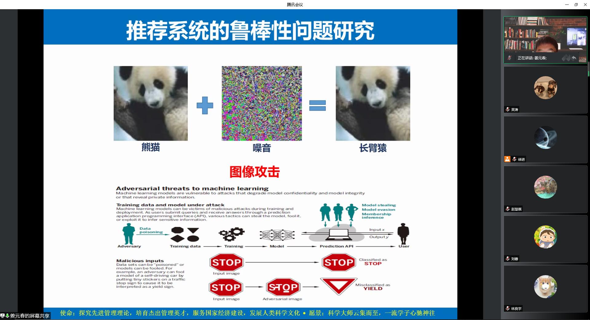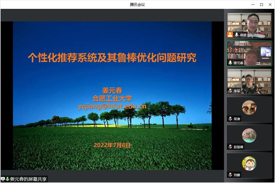 2022年7月8日上午9点30分,合肥工业大学管理公司姜元春教授应邀以“个性化推荐系统及其鲁棒优化问题研究”为题在线上为公司师生带来了一场精彩的学术分享,本次学术活动由公司信息系统与运营管理系徐进副教授主持,公司副经理聂佳佳教授、公司教授委员会副主任李军教授、刘盾教授、实验室执行主任耿维副教授及40多名研究生参加了本次线上学术活动。