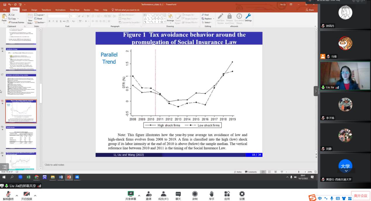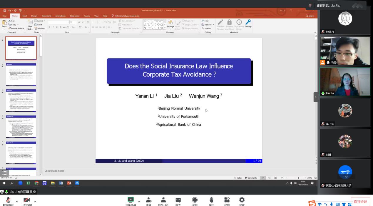12月14日下午16点30分,应公司邀请英国朴茨茅斯大学商公司刘嘉教授带来了题为“Does the Social Insurance Law Influence Corporate Tax Avoidance?”的线上学术讲座。讲座由金融与财务学系马锋副教授主持,公司黄登仕教授,朱宏泉教授、诸波和梁超等教师及研究生参与本次学术交流活动。