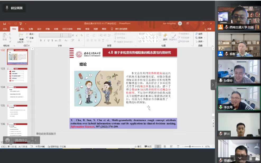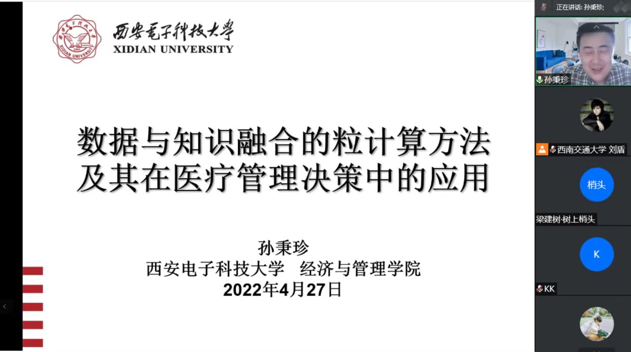 2022年4月27日下午2点,西安电子科技大学孙秉珍教授和昆明理工大学李金海教授应邀在腾讯会议上分别开展了题为“数据与知识融合的粒计算方法及其在医疗管理决策中的应用”、“网络概念知识发现”的线上学术报告。bevictor伟德信息系统与运营管理系刘盾教授主持了此次讲座,校内外师生100余人参加了此次学术交流。