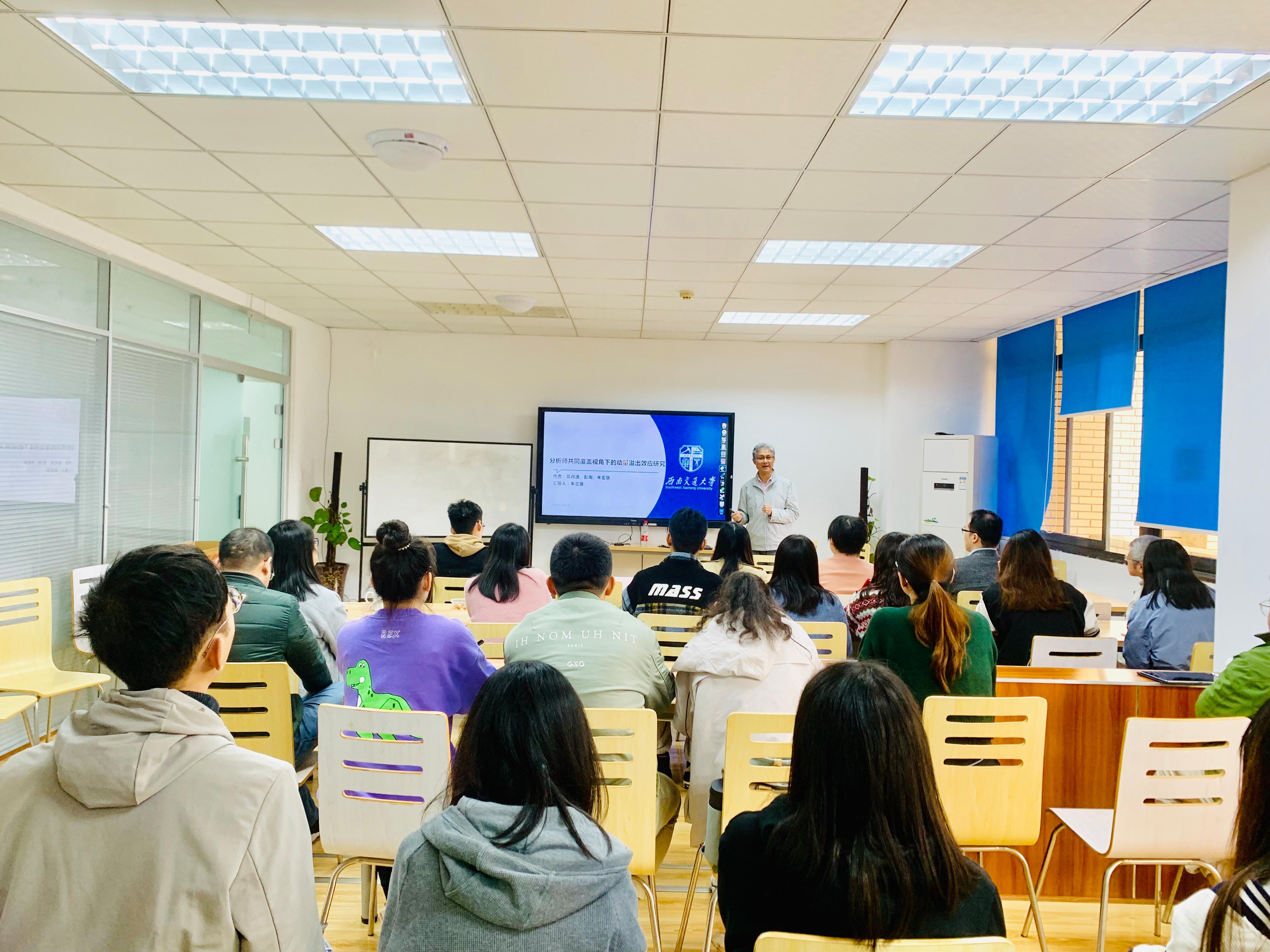 朱宏泉教授首先为大家进行了“破题”。为了让大家迅速把握论文核心观点,朱教授以在座师生共同的对金融学的热爱类比题目中的“共同覆盖”,又将“动量”、“溢出效应”比喻为“刹车时的惯性”、“人际交往中的正能量转递”,拉近学术与生活的距离,也让大家对主题更为明晰。