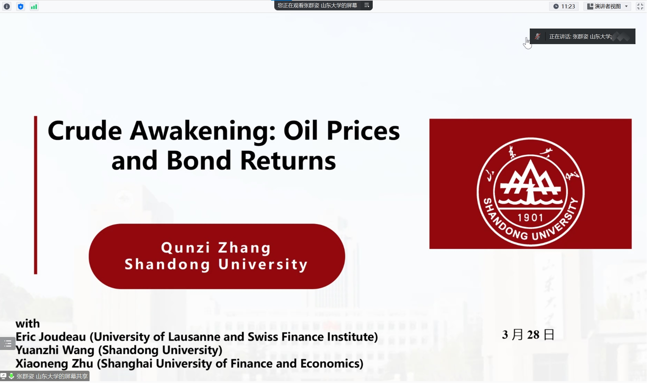 2023年3月29日上午10点,山东大学经济公司金融系张群姿教授为公司师生分享题为“Crude Awakening: Oil Prices and Bond Returns”的学术报告,讲座由bevictor伟德金融与财务学系马锋副教授主持,公司老师和研究生同学积极参与了此次讲座。