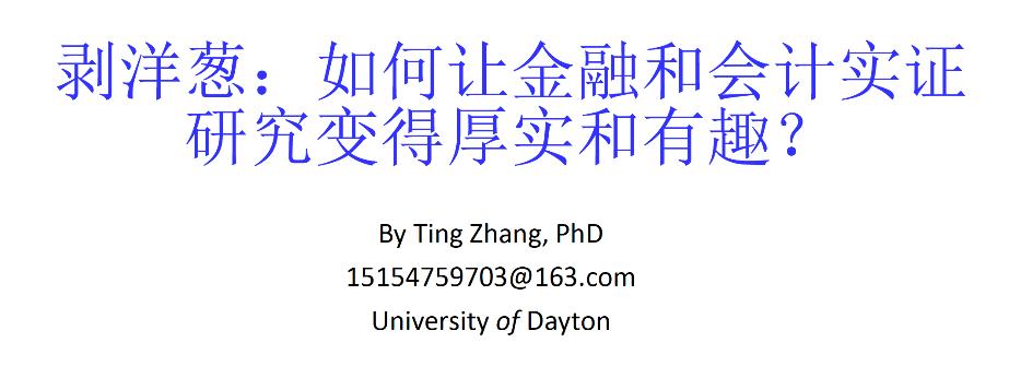 首先,张霆教授围绕如何让金融和会计实证研究变得厚实和有趣为主题,以4篇高水平论文为例,类比“剥洋葱”的方法,从理论、实证方法、写作、内生性等方面徐徐展开。张教授将论文写作类比说相声、抖包袱,得最大限度地吸引读者、审稿人,达到眼前一亮的效果。