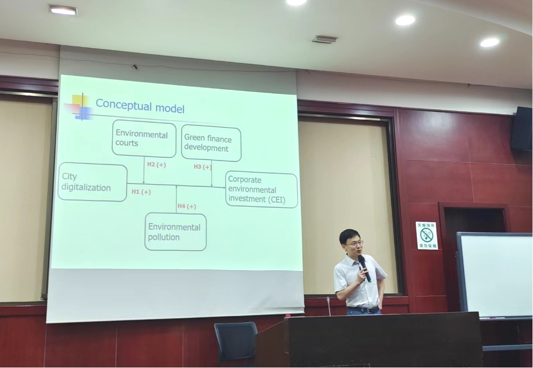 其次,周政教授通过他本人的两篇工作论文,为我们详细说明了“如何提炼模型”。周政教授指出,好的研究模型应该是从理论提炼出来的,这样最不容易引起审稿人的批评。例如,在研究城市数字化对当地企业环境投入的影响时,他根据制度视角的三种制度压力引出环保法庭、绿色金融发展、环境污染三个调节变量。在研究城市数字化对当地企业不当行为的影响时,他基于信息视角提出城市数字化能够促进信息的流动,从而抑制企业的不当行为,而当地的官僚腐败(能够扭曲信息)、赌博偏好(影响信息解读)、关系导向(代表私人信息)三个调节变量对信息传递有不利影响,从而负向调节主效应。周政教授还指出,标准的战略营销研究模型应该是“一拖四”或“一拖三”,即一个主效应连接三个调节效应或四个调节效应。