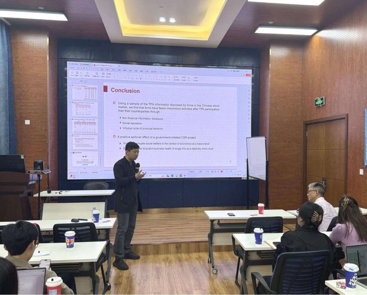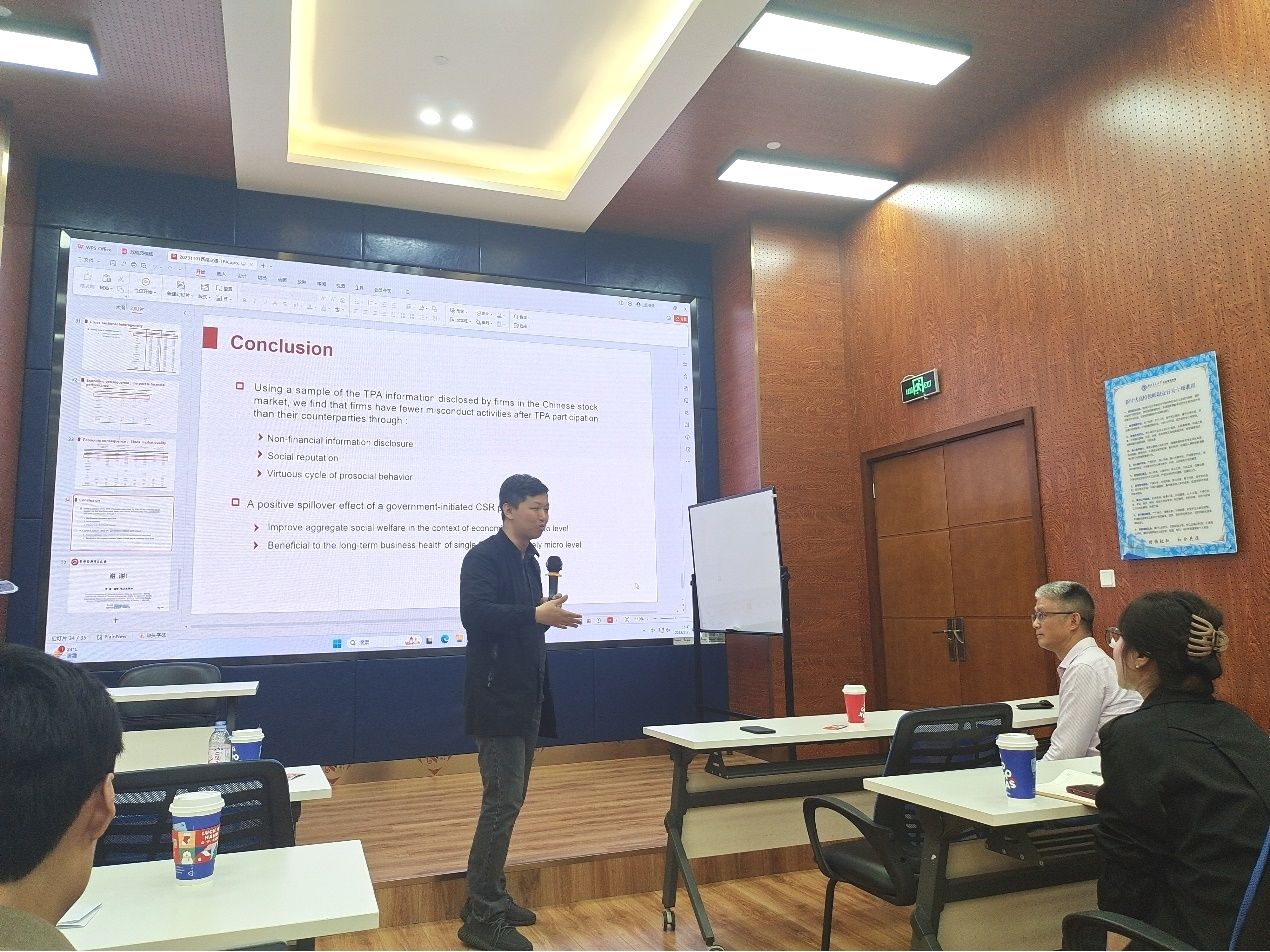 2023年11月1日下午15:00,首都经济贸易大学金融公司何枫教授应邀在九里校区0218室为公司师生作了一场题为“Government initiated CSR and corporate governance: theoretical and empirical analysis”的讲座。此次学术活动由公司金融与财务学系马锋副教授主持,公司部分教师以及研究生参加此次活动,马锋副教授对何枫教授的学术成果进行了介绍,同时对何教授的到来表示热烈的欢迎和感谢。