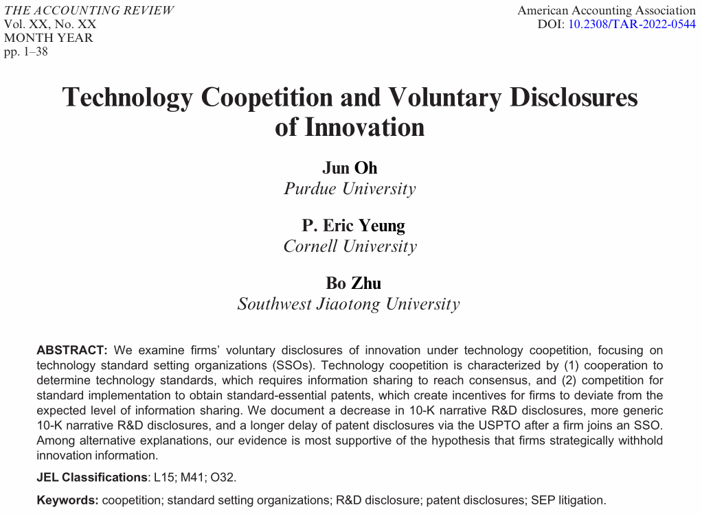 bevictor伟德会计学系副教授诸波于2024年8月在UTD 24期刊The Accounting Review在线公开发表题为Technology Coopetition and Voluntary Disclosures of Innovation的论文。该论文以技术标准制定机构(SSO)为研究对象,考察了企业在技术竞合下创新的资源披露情况。技术竞合的特点是:(1)合作制定技术标准,这要求企业信息共享以达成共识;(2)竞争标准执行以获得标准必要专利,这会激励企业偏离预期的信息共享水平。研究发现,在企业加入SSO后,减少了10-K文件中的叙事性研发披露、10-K文件中披露更通用的叙事性研发信息,更长地延迟通过美国专利商标局进行专利披露。论文的实证证据支持企业策略性地隐瞒创新信息披露的假设。