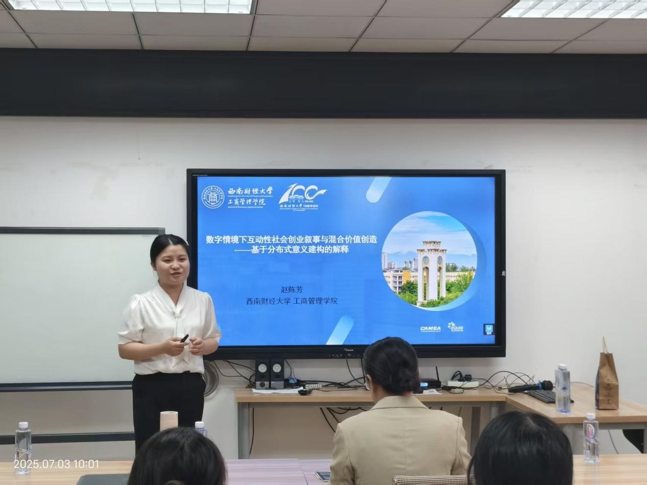 2025年7月3日上午于九里校区零号楼0411教室,公司特邀西南财经大学工商管理公司赵陈芳助理教授进行题为《数字创业叙事对社会创业绩效的影响研究——基于意义建构视角》的讲座。本次讲座由公司创新创业与管理学系副教授刘玉焕主持,吸引了公司部分师生现场聆听与交流。