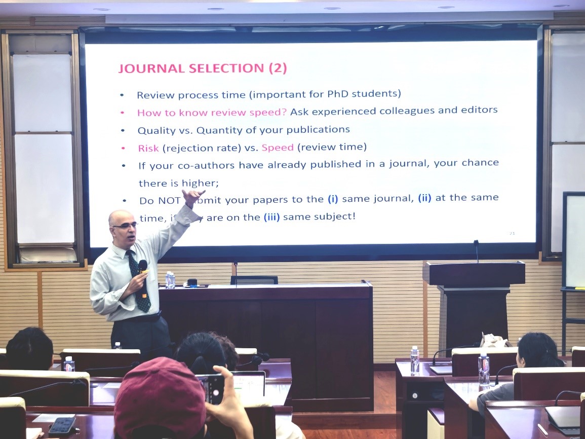 讲座聚焦于“如何在顶级期刊成功发表论文”这一议题。Reza教授首先结合自身担任主编的经验,深度剖析了物流与运输领域旗舰期刊Transportation Research Part E (TR-E)的审稿流程、投稿要求、期刊偏好以及常见的退稿原因,为师生们提供了极具针对性的投稿策略指导,随后,他系统性地分享了在权威期刊发表论文的通用原则与实用技巧,内容涵盖研究选题、贡献定位、论文结构设计以及如何契合期刊编辑标准等关键环节。他强调,无论是理论分析、实证研究还是跨学科工作,清晰定位研究的核心贡献并符合期刊目标是成功的关键。