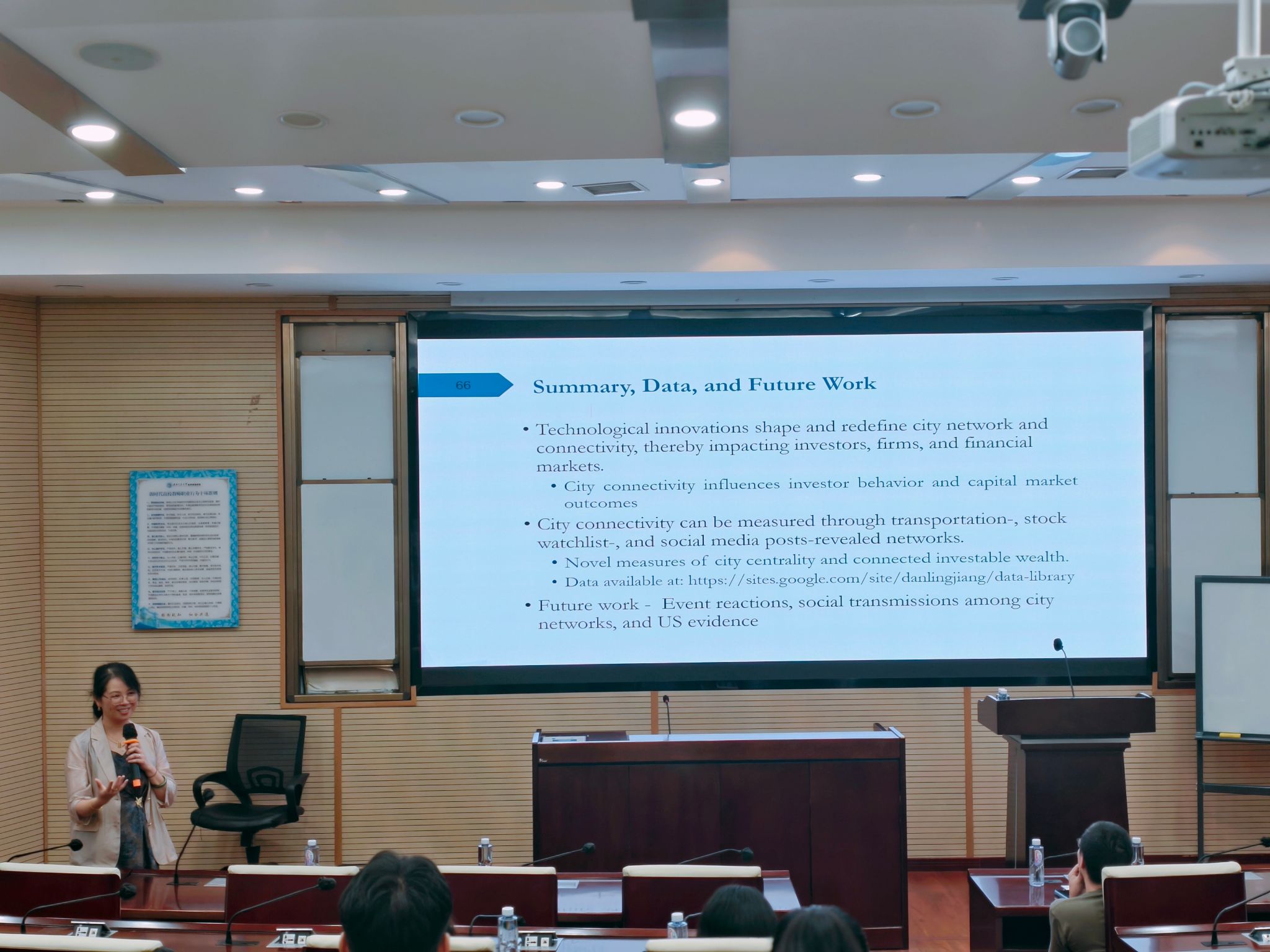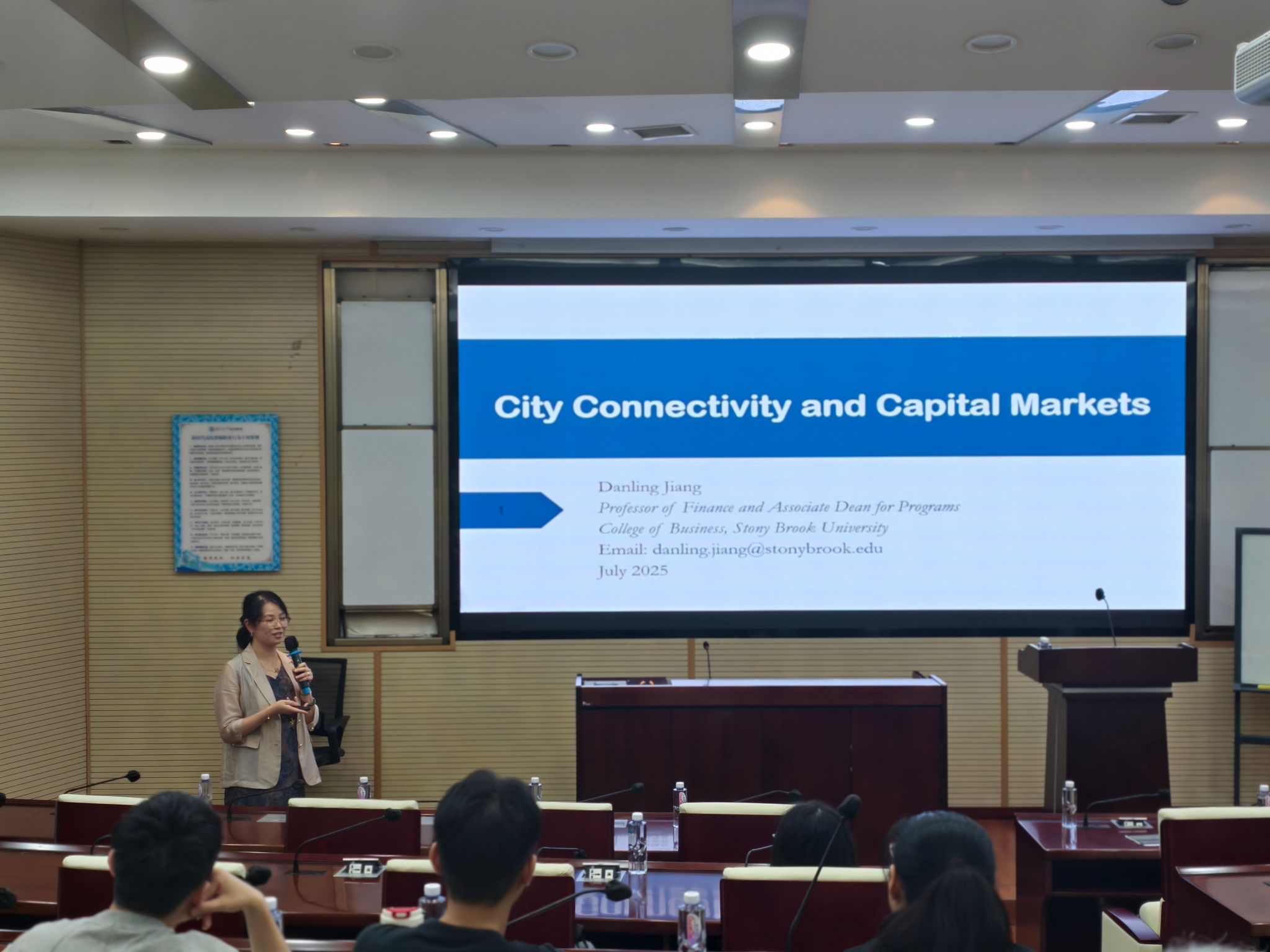 2025年7月7日下午,美国纽约州立大学石溪分校教授、伟德bevictor中文版扬华讲座教授蒋丹凌应邀在九里校区零号楼0204室开展题为“City Connectivity and Capital Markets”的学术报告,金融与财务学系主任董大勇教授主持了此次学术活动。董大勇教授介绍了蒋丹凌教授的学术背景及研究成果,并对蒋丹凌教授的到来表示热烈的欢迎。公司金融与财务学系黄登仕教授、朱宏泉教授等近50余名师生参加了此次活动。