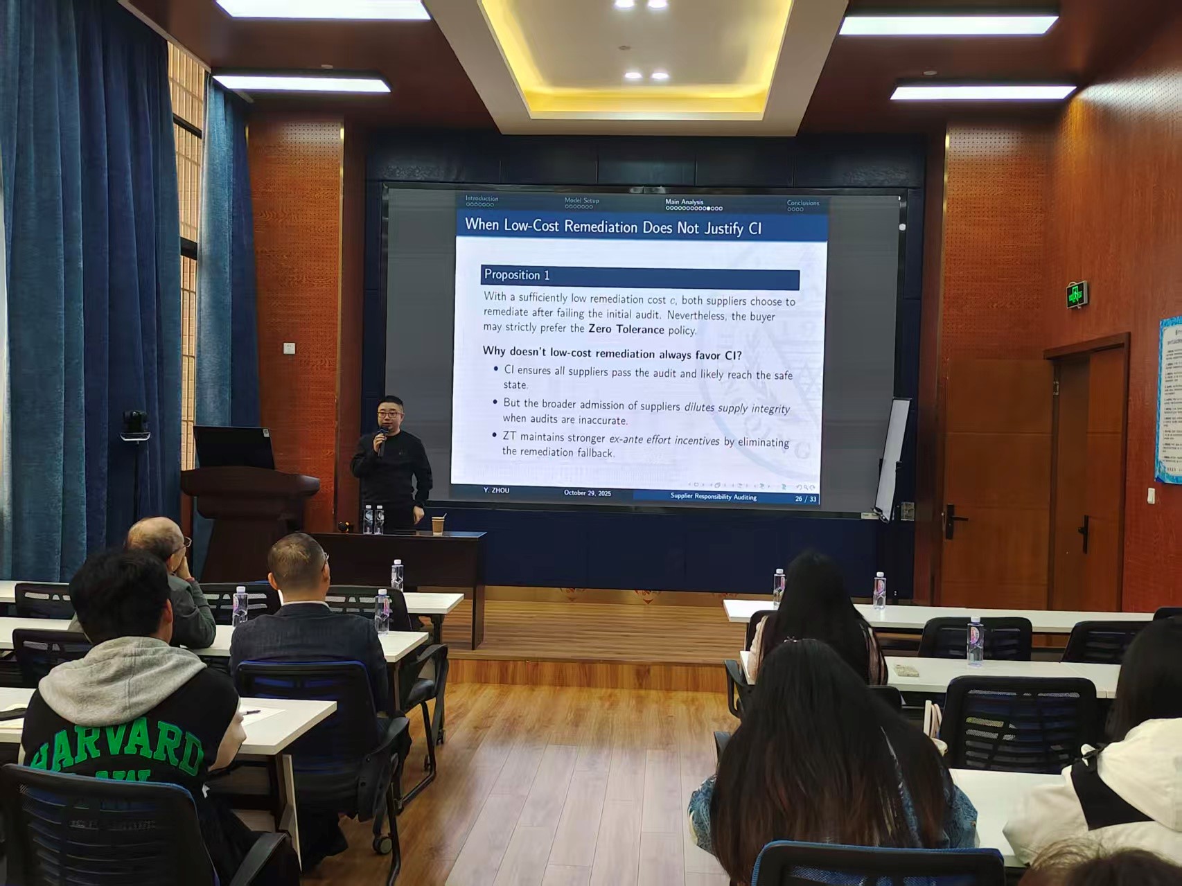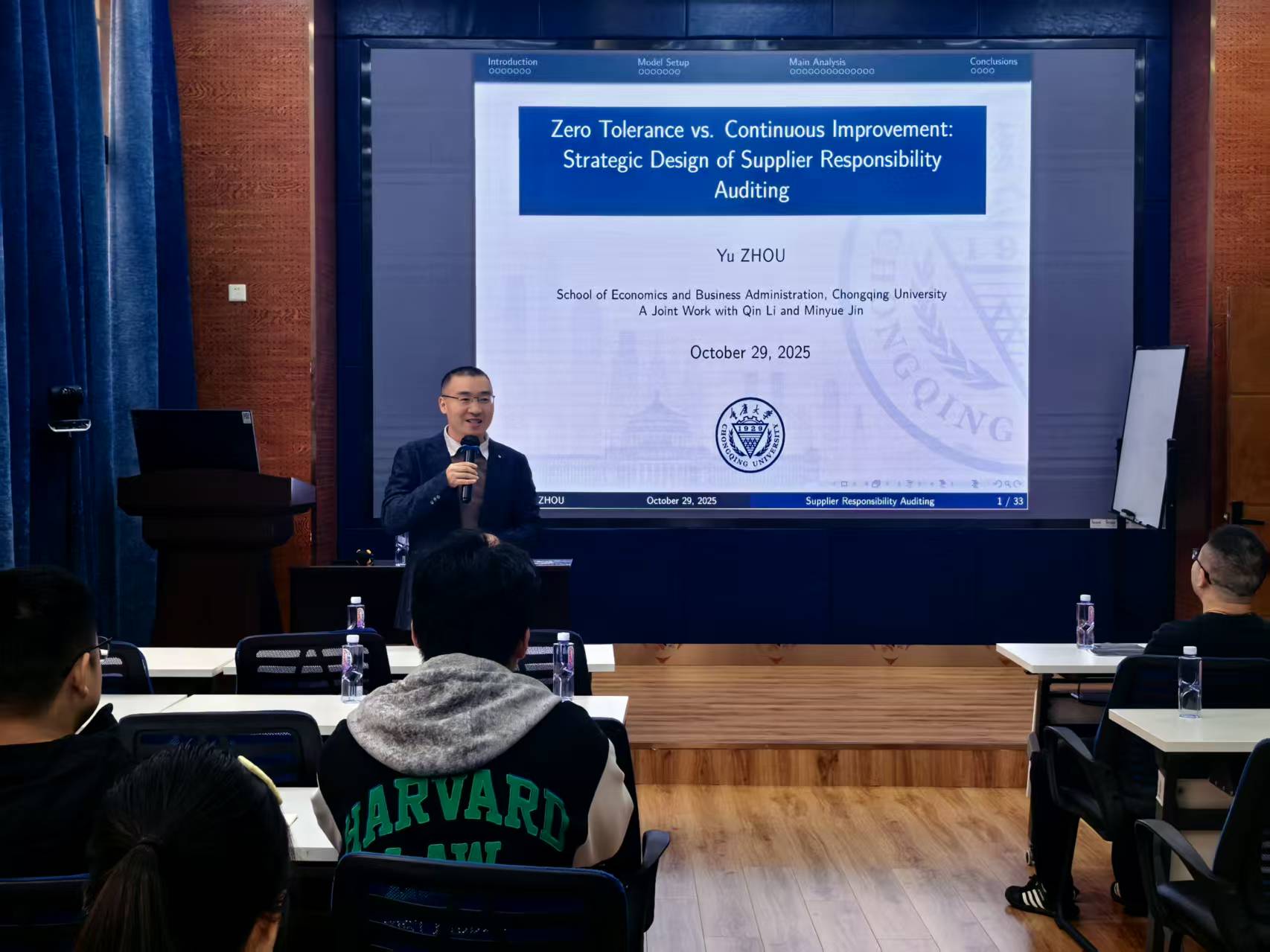 2025年10月31日上午,重庆大学经济与工商管理公司周宇教授应邀在九里校区零号楼0218室为公司师生作题为“Zero Tolerance vs. Continuous Improvement: Strategic Design of Supplier Responsibility Auditing”的学术讲座。本次讲座由公司副经理聂佳佳教授主持,公司多位教师及员工参与此次活动。