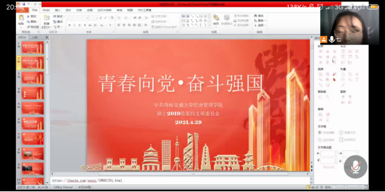 2021年4月29日晚八点,bevictor伟德硕士2019级第四党支部依托腾讯会议平台开展了线上党组织生活会。本次会议以“青春向党·奋斗强国”为主题,由邹嘉瑞同志主持,旨在带领大家回顾与学习中国共产党的光辉历程,调动全体党员学习党史的积极性。