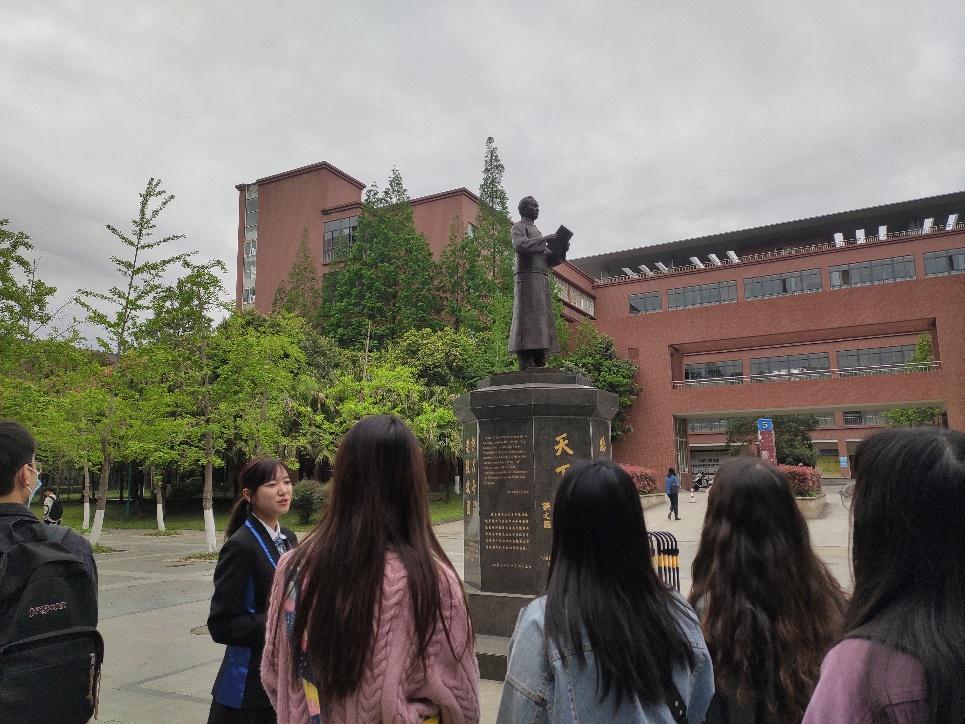 校园内有许多名人雕塑,其中有一处1:1的铜像引起了大家的注意,这是青年时期双手捧着书本的孙中山。校园大使为大家讲解说,这是为纪念辛亥革命100周年,孙中山先生的孙女孙穗芳博士在全世界范围内捐赠100尊孙中山先生的铜像。雕像高约2层楼,由两部分组成,上部是中山铜像,下部分则是花岗石的8边形柱体底座。底座的每一面都有金色镌刻,除了“天下为公”等孙中山亲书字样,还在背面刻有西南交大与孙中山的渊源。