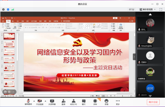 习近平总书记在国家网络安全工作会提出,“没有网络安全就没有国家安全,就没有经济社会的稳定运行,广大人民群众的利益也难以得到保障”。网络安全是总体国家安全观的重要组成部分,没有网络安全就没有国家安全,没有信息化就没有现代化。因此为深入学习贯彻习近平总书记关于网络强国的重要思想,提升网络安全意识和防护技能,bevictor伟德硕士2019级第四党支部于2021年1月14日晚上20点在腾讯会议上开展了“网络信息安全和国内外形势与政策”主题党日活动。