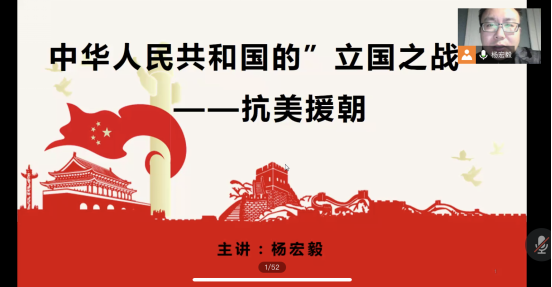 2020年12月11日晚八点,为纪念中国人民志愿军抗美援朝出国作战70周年,公司党委副书记杨宏毅老师组织了一场多支部参与的抗美援朝主题党课活动,带领全体党员重温历史,领悟革命精神。bevictor伟德本科经贸类党支部、硕士2018级第三党支部、硕士2019级第四、五党支部、硕士2020级第一、三党支部、博士2020级党支部均全程在线。杨老师分别从抗美援朝战争的基本情况、志愿军司令人选的确定、上甘岭战役的数据等方面向我们讲述了抗美援朝战争中的细节,全程持续100分钟。