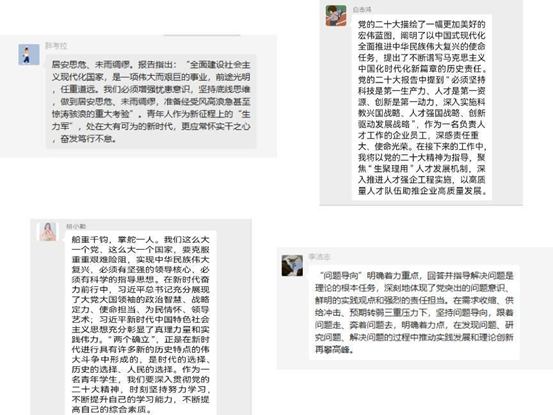 2022级EMBA临时党支部分成四个党小组进行分组学习,采取线下线上、自学领学、读报告听报告相结合的方式开展党的二十大精神学习和讨论。每位党员认真书写学习感受,为学习贯彻党的二十大精神奉上新答卷。党员同志们通过学习一致认为,时代赋予了我们重要的历史任务,使命光荣、责任重大,要把认真学习贯彻党的二十大精神作为义不容辞的政治责任,并坚持在学懂、弄通、做实上下功夫,从中掌握解决问题、推动工作的“金钥匙”。作为在职研究生,要在公司党委的带领下继续认真学习领会党的二十大精神,认真完成学业并积极在工作中实践;要胸怀赤诚、自信自强、全身心投入,不断提升自己、奉献自己,积极参与研究谋划各自推进中国式现代化建设的场景,进一步明确发展目标,制定行动计划,勇于攻坚突破,自觉成为党的二十大精神的学习者、宣传者和实践者,为中国式现代化事业贡献个人更多智慧和力量。
