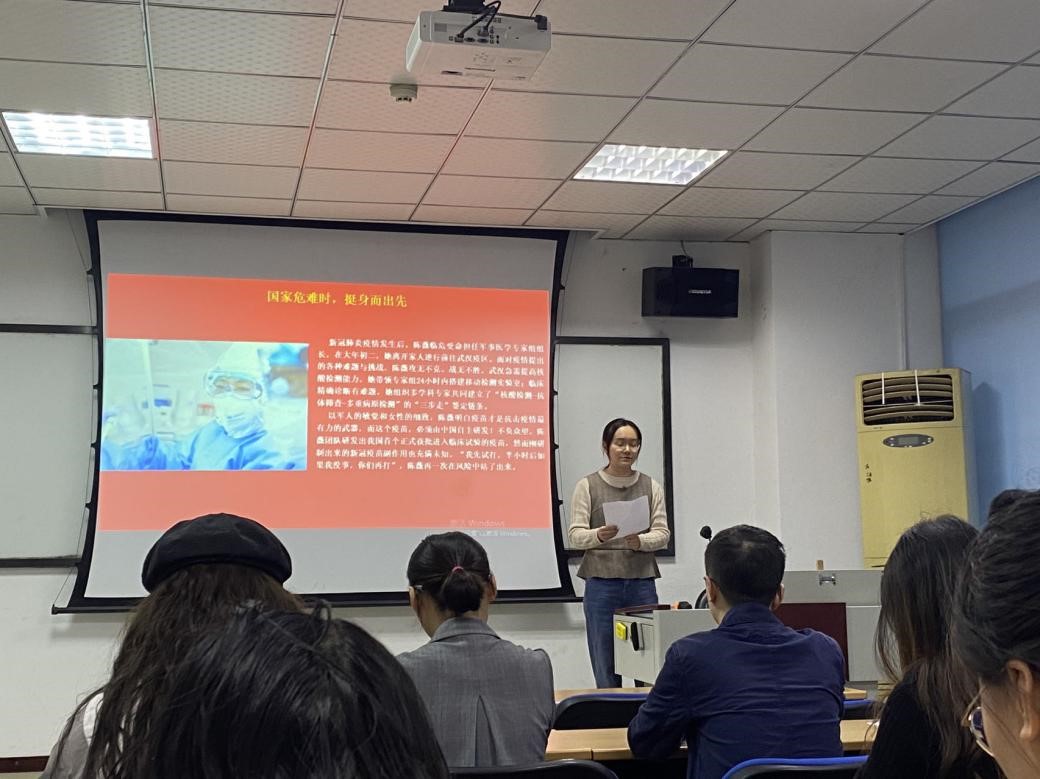 接着本次活动邀请了党员陈艺鑫同志分享了阅读内容。作为党员读书班优秀学习的代表,陈艺鑫同志围绕“人民英雄”为国铸盾的巾帼院士——陈薇院士的英雄事迹,做出了题为“奋进在研途,筑梦新征程”的分享。内容主要从“默默忙奉献,与毒齐共舞”、“国家危难时,挺身而出先”、“淡泊名与利,宠辱永不惊”三个篇章进行阐述。