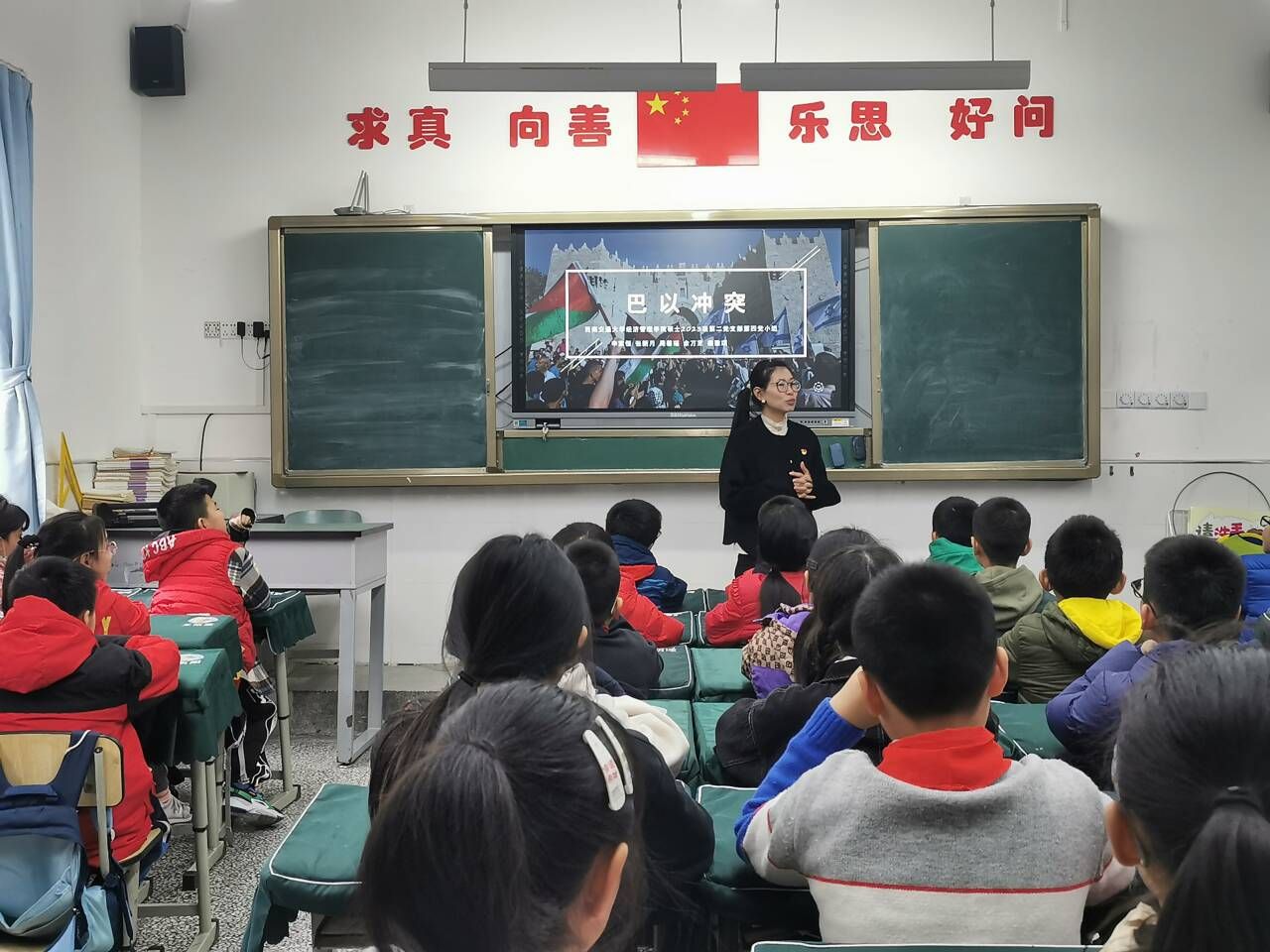 习近平总书记在党的二十大报告中强调:“前进道路上,全党要坚持全心全意为人民服务的根本宗旨,树牢群众观点,贯彻群众路线,尊重人民首创精神,坚持一切为了人民、一切依靠人民,从群众中来、到群众中去,始终保持同人民群众的血肉联系,始终接受人民批评和监督,始终同人民同呼吸、共命运、心连心。”为响应习近平总书记的重要指示,让党员同志积极为群众服务,2023年12月1日,bevictor伟德硕士2023级第二党支部书记贾佳老师带着硕士2023级第二党支部的党员们来到了伟德bevictor中文版子弟小学,就同学们近日关心的国际热点问题进行了相关知识的讲解。