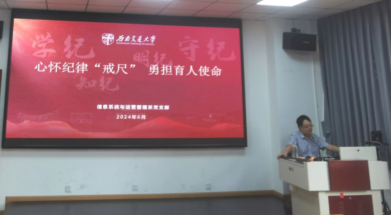 2024年6月27日下午2点,信息系统与运营管理系党支部在九里校区J0318教室开展了党纪学习教育专题教育。党支部书记刘盾同志主持并讲授党课,公司党委委员、副经理聂佳佳同志列席并指导本次专题党课活动,学系党员同志参与了党课学习。